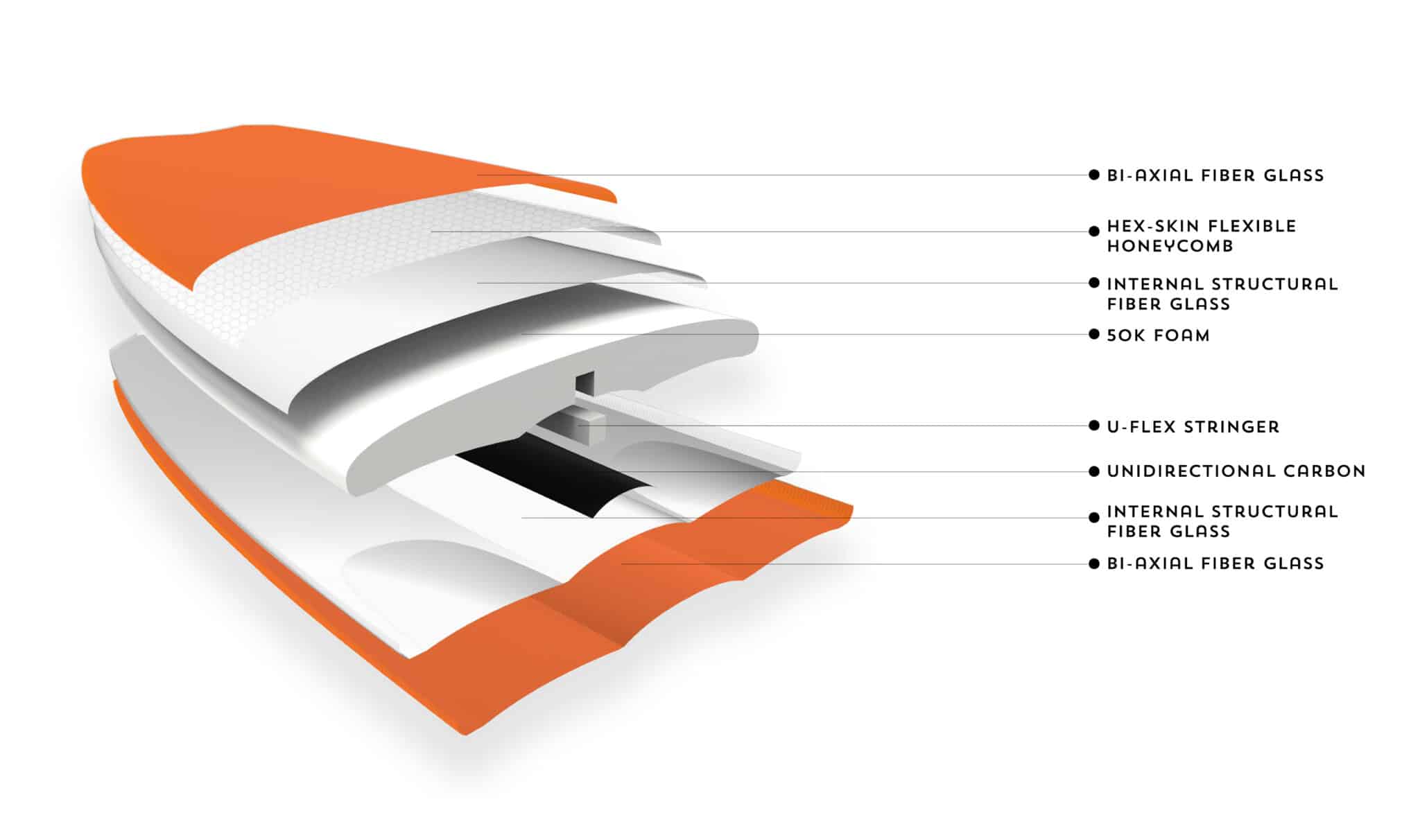 Every board we make starts with a foam core of our very own 50K closed cell foam. This foam is formalized exclusively for us, it is not used in any other board in the market. The foam can withstand 50.000 kg per square meter, while staying very light, and most of all very flexible. Another plus of our 50K foam is that it is closed cell, meaning that the foam will not take in water. And the board will not blow out when it gets hot.