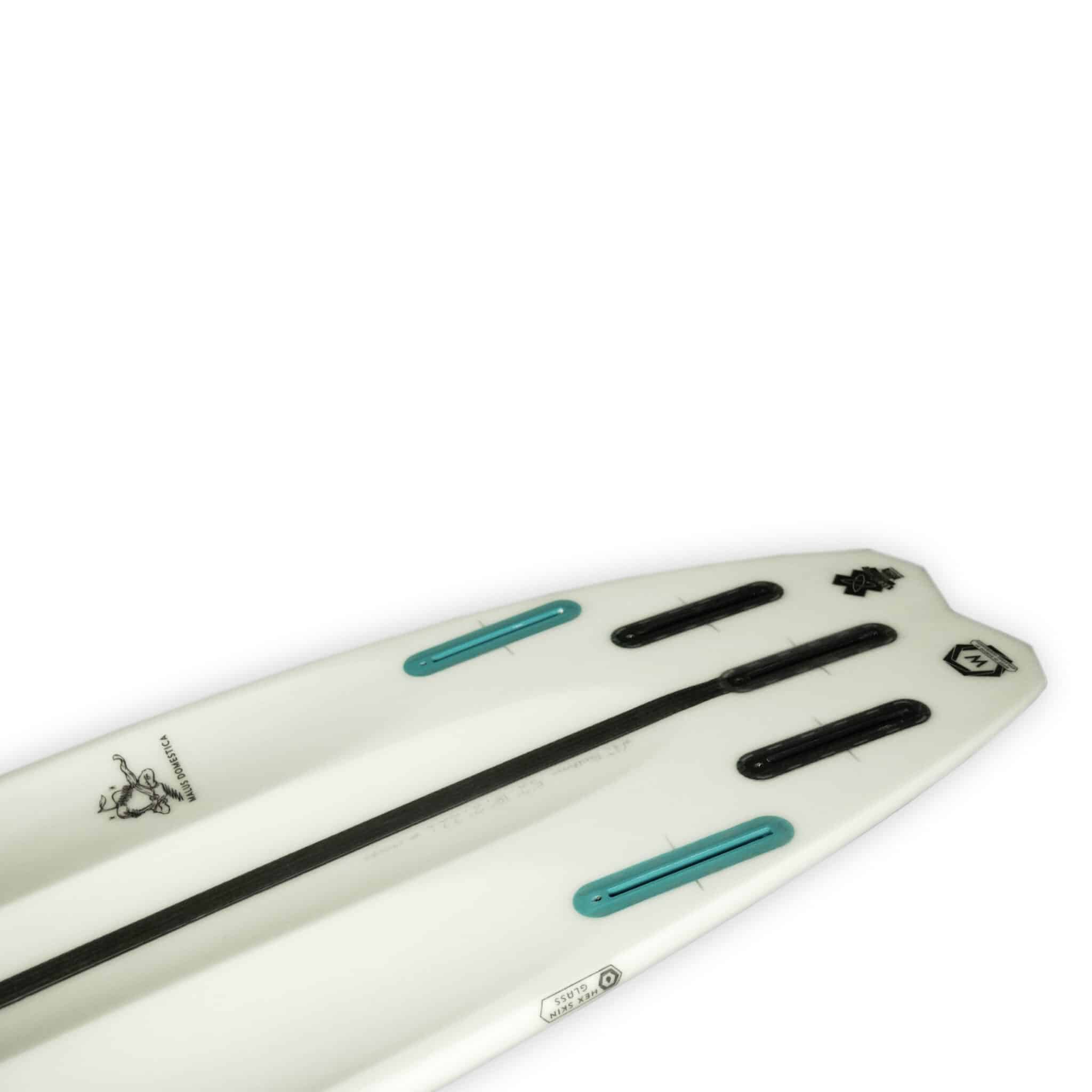 White-line Boards have FUTURES fin boxes as standard. The two side fin boxes are in teal color. The deck of the white-line boards are lined with the hex-skin single layer sandwich with an extra internal patch under the front foot. This construction has proven to be more than strong enough for almost all riders, especially with a deck pad. White-line is the best balance in flex, weight and durability for most riders.