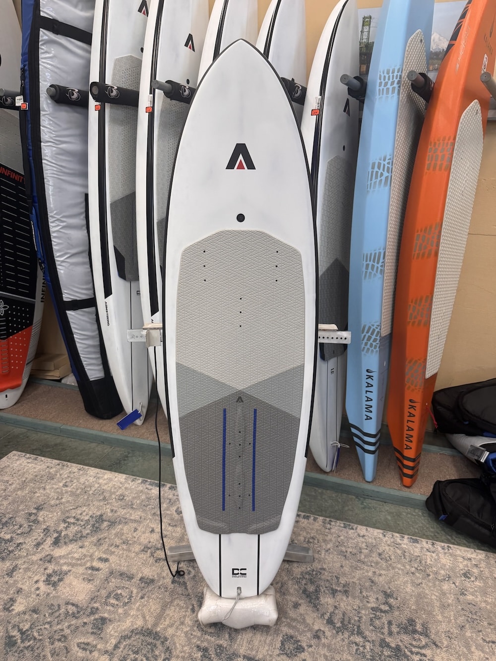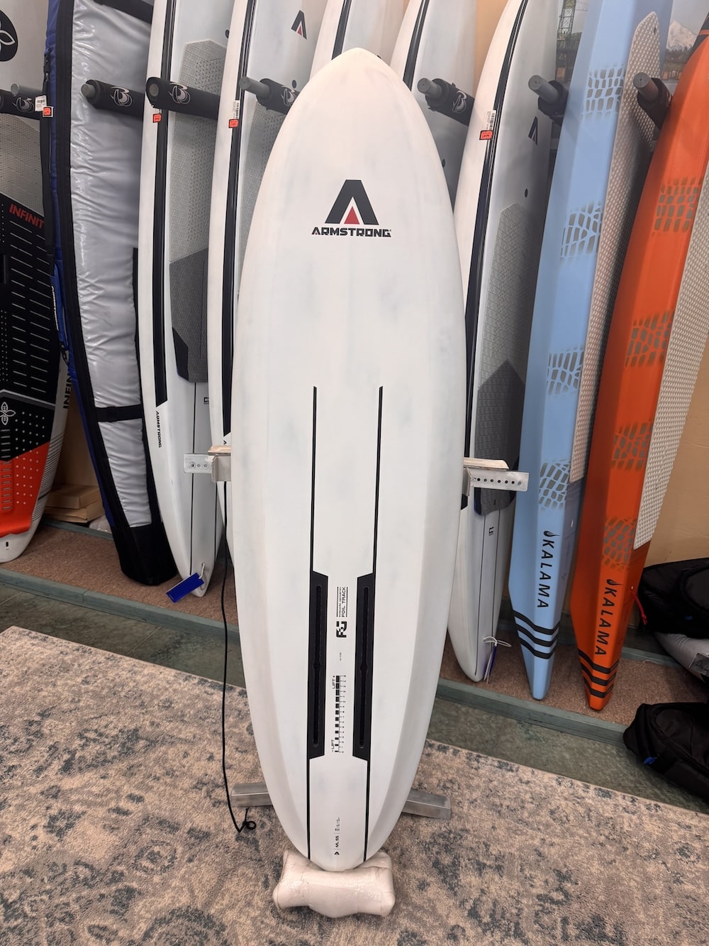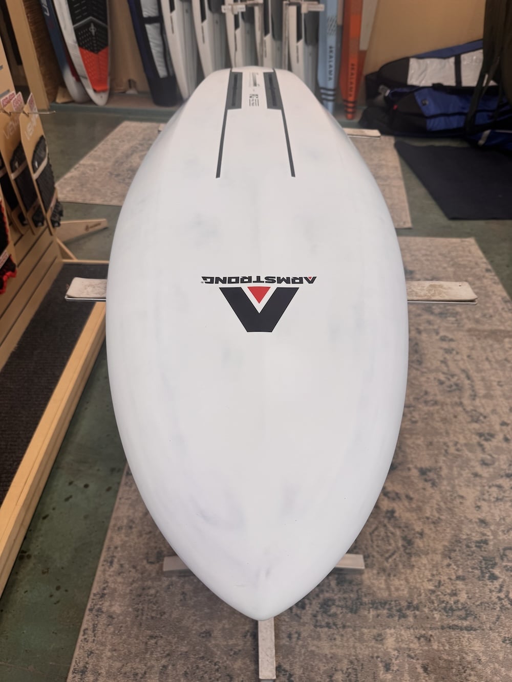 “B+” condition. Gently used at a trade show here in Hood River, Oregon. Includes Armstrong board bag and 6-month board warranty.