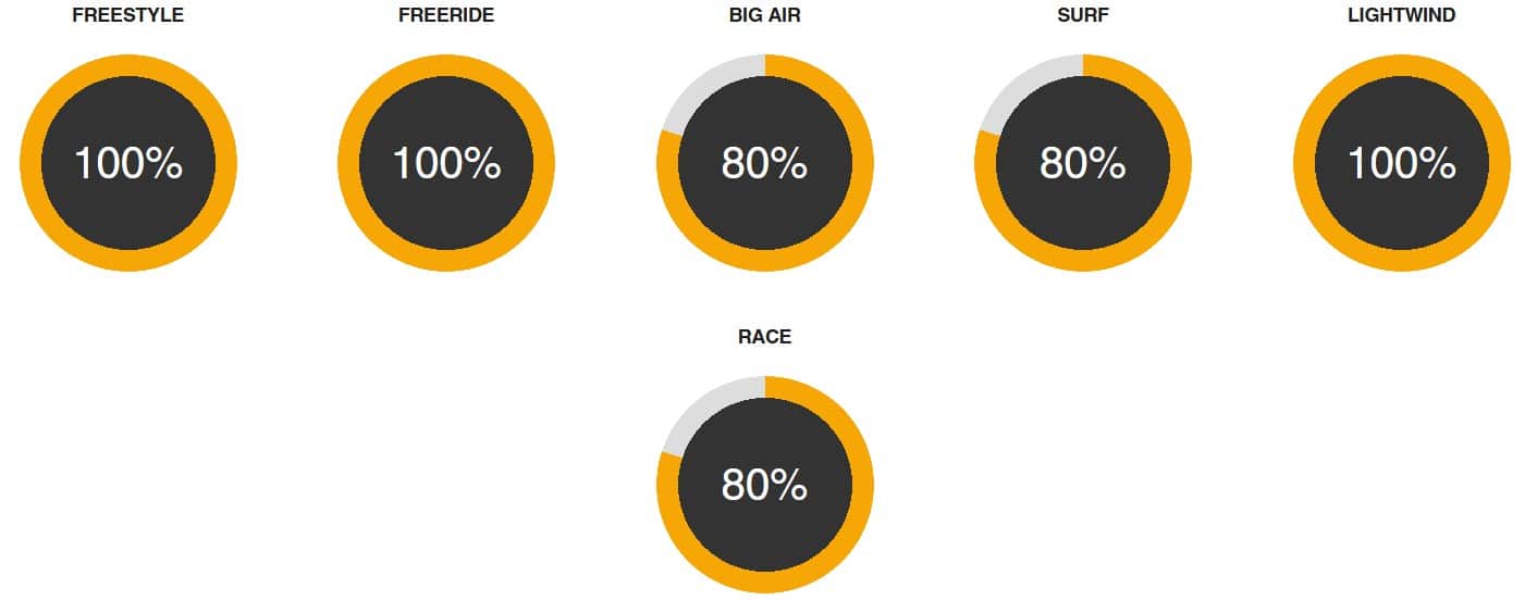 TIP TWIST: Progressive tip twist as the sizing increases in the Vision range helps keep sheeting relative and responsive no matter what size wing you ride.