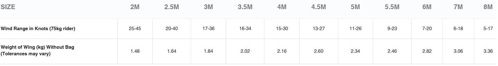 The small sizes excel in high winds due to the reactive sheeting, where are as the larger 6/7/8m were designed with lighter winds in mind to get you up and riding when most are sitting on the beach.