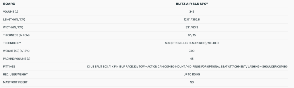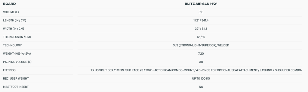 The BLITZ AIR SLS comes fully equipped with a US Split Box and iSUP Race 23 fin for reliable tracking. Recommended rider weight is up to 100 kg.