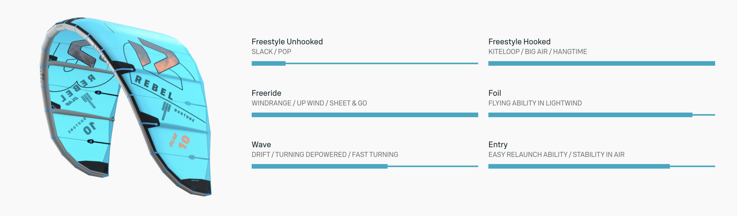 Faster and more reliable loop recovery is another hallmark of the Rebel D/LAB. Refined arc and shape, paired with reduced bridle friction, enable the kite to climb back up quickly after loops, granting riders increased control and confidence during dynamic transitions. The incorporation of Aluula D/TX in the leading edge and struts leads to lighter, more dynamic handling, making the kite more torsionally responsive and playful in the air. This enhancement contributes to improved steering and responsiveness, ensuring the kite maintains its shape in powered conditions, allowing for precise turning and control during high-performance maneuvers. With modernized big air performance built on the legendary Rebel DNA, the Rebel D/LAB complements today’s big air demands, making it ideal for hangtime, board-offs, and technical air tricks. Experience the pinnacle of performance and go beyond the imaginary with the Duotone Rebel D/LAB 2026.