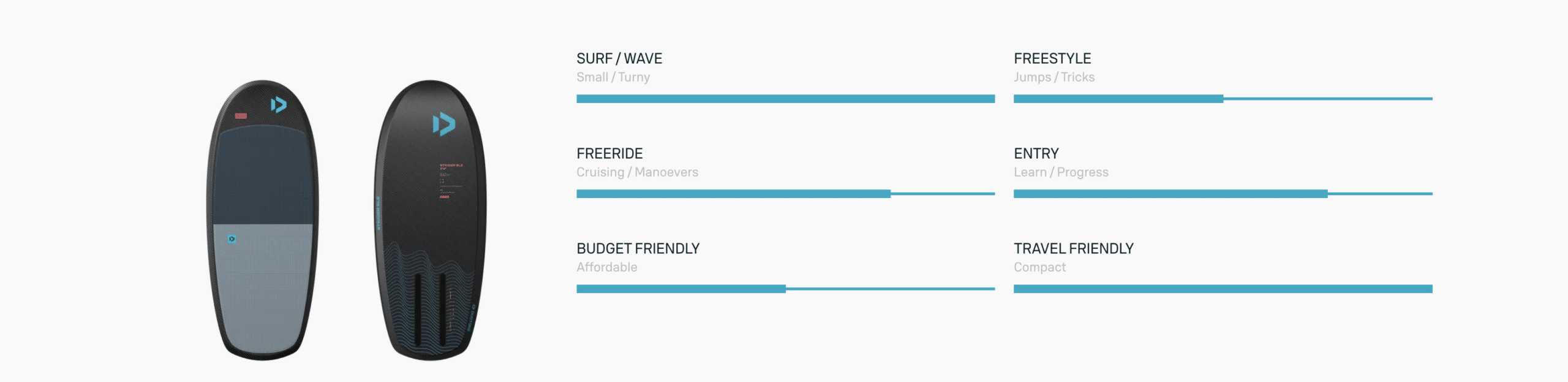 The Striders compact shape makes it the perfect size for pumping without having to worry about any unnecessary swing weight, allowing you to stay up on the foil for longer. The flat rocker from tail to front foot ensures efficient pumping with maximum projection. The shape is short, but still features sufficient length to make starts easy to control and a small nose flick enables recovery when touching down.