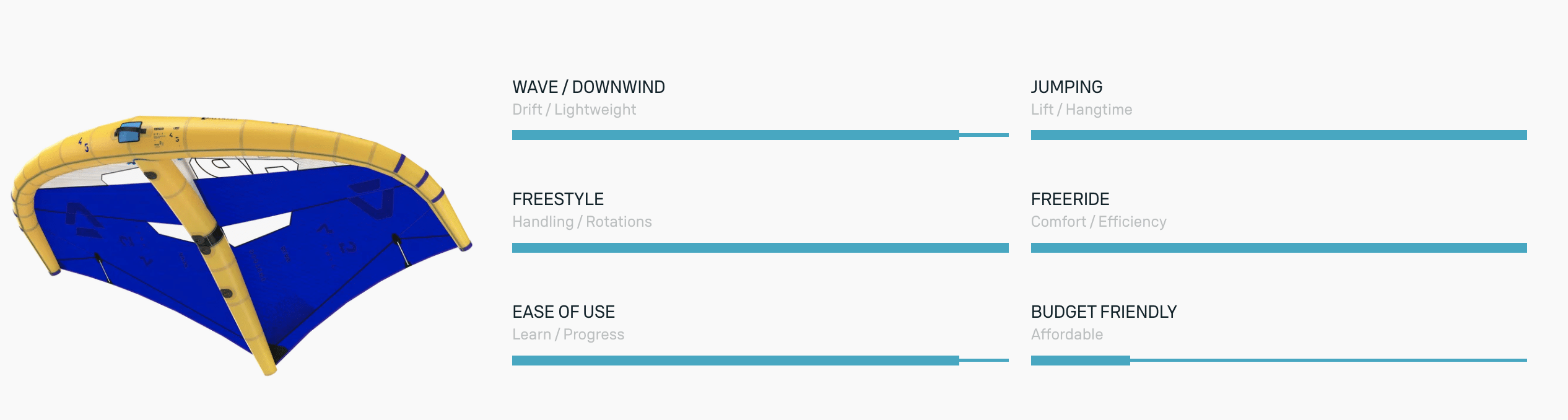 Drift stability and wave steering have been enhanced with a new, stiffer leading-edge handle, allowing for more precise control and excellent steering while the wing is flagged. Improved window placements offer better visibility, and the refined canopy tension and tip twist enhance the overall performance of the wing.