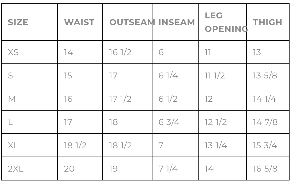 These dimensions were recorded by laying each short flat and measuring directly across the garment.