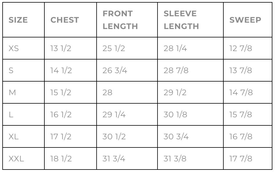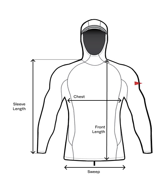 CHEST – Lay the rashguard flat and measure straight across the chest from side to side 1″ below the armhole. FRONT LENGTH – Measure from the highest point of the shoulder straight down to the bottom hem. SLEEVE LENGTH – Measure from the shoulder seam straight out to the end of the sleeve hem. SWEEP – Lay the hem flat and measure straight across the bottom opening.