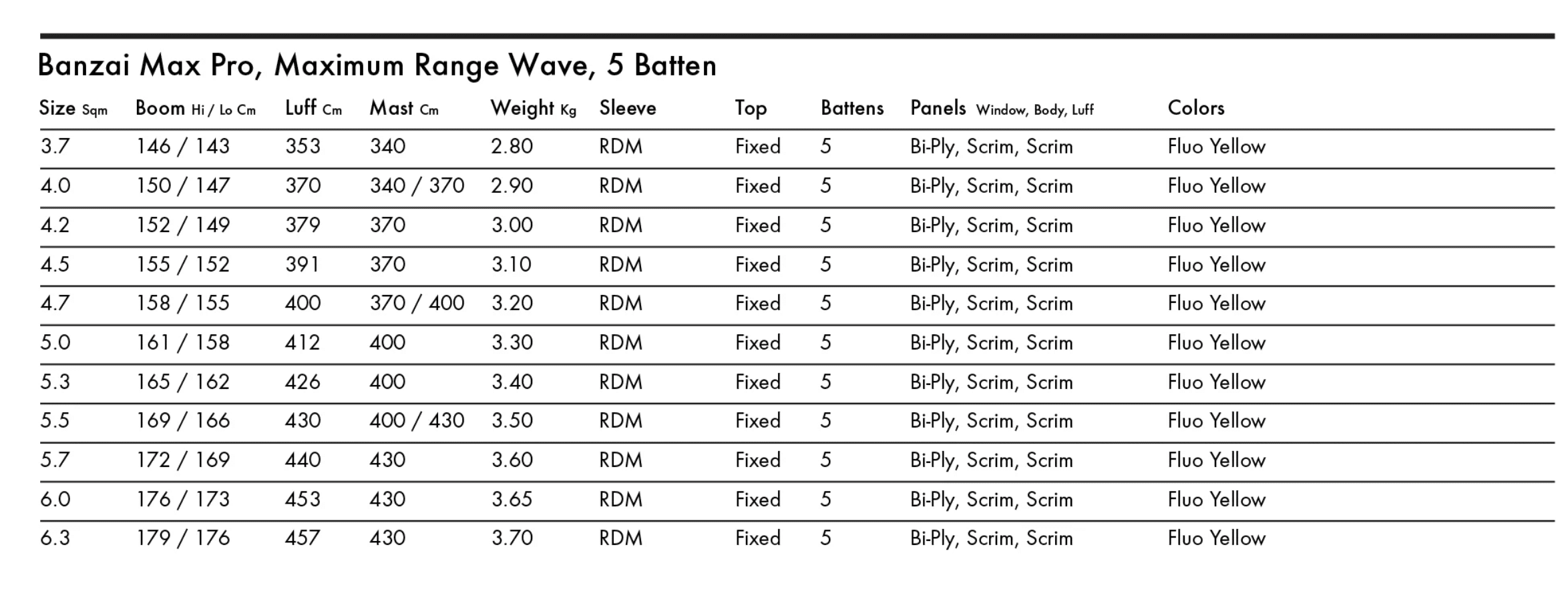 Available in 3.7, 4.0, 4.2, 4.5, 4.7, 5.0, 5.3, 5.5, 5.7, 6.0, 6.3 square meters. IWT and PWA World Cup Approved. Pro Construction, Bi-Ply window, Scrim panels. Available in Fluo Yellow with Fluo Orange logos.
