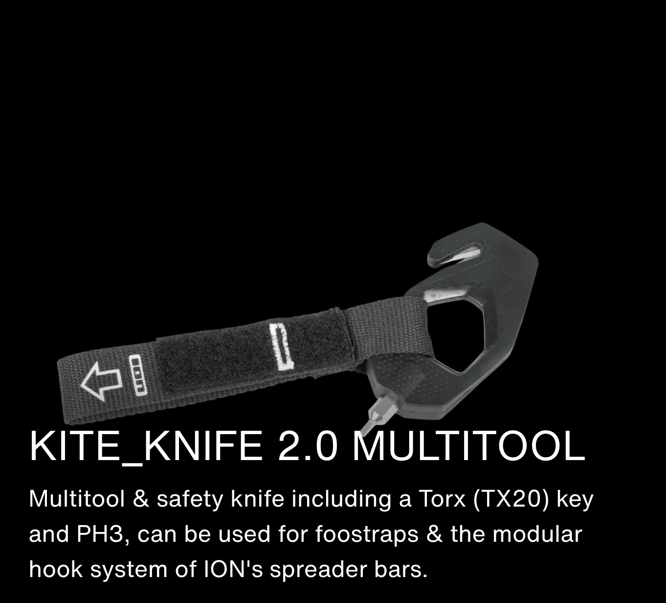 Multitool & safety knife including a Torx (TX20) key and PH3, can be used for foostraps & the modular hook system of ION’s spreader bars.