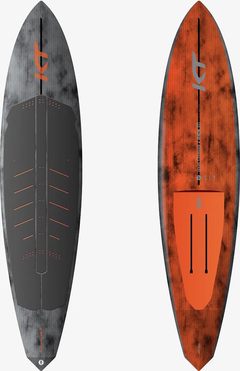 Available in 88, 95, 100, 105, 110, 121, 135 liters. Seamless Form Technology, Full Carbon Hull. US track boxes: 2x 13”. All new KT Surfing ® Single Density Traction Pads, segmented, slotted for weight saving. Available in Metallic Silver and Neon Orange Tech-Reveal KT finish, with inverted artwork and charcoal pads.
