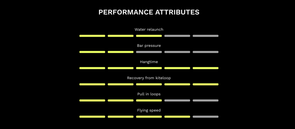 The kite is very differently designed from anything else in the line. With a 5-strut, high-aspect ratio combined with efficient, fast profiles, the kite wants to do nothing but drive forward and upward at all times. This combination results in vertical takeoffs, huge hangtime, and a kite that stays ready above you to give a great second lift from downloops on the way down. The pull in the loop is an easy-to-predict progressive feel, accelerating through the arcing turn, ready to shoot back above your head as soon as it is complete.