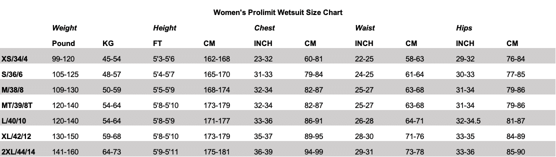 Women's Prolimit Size Chart